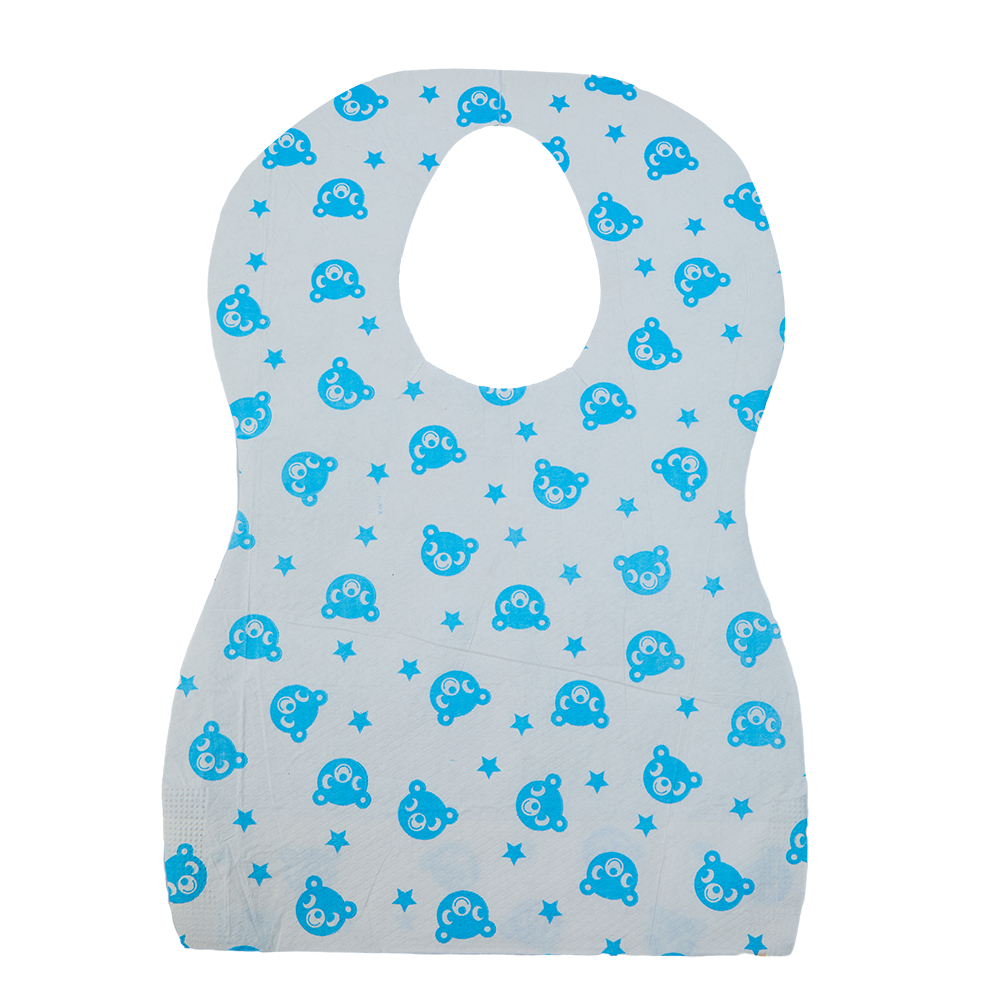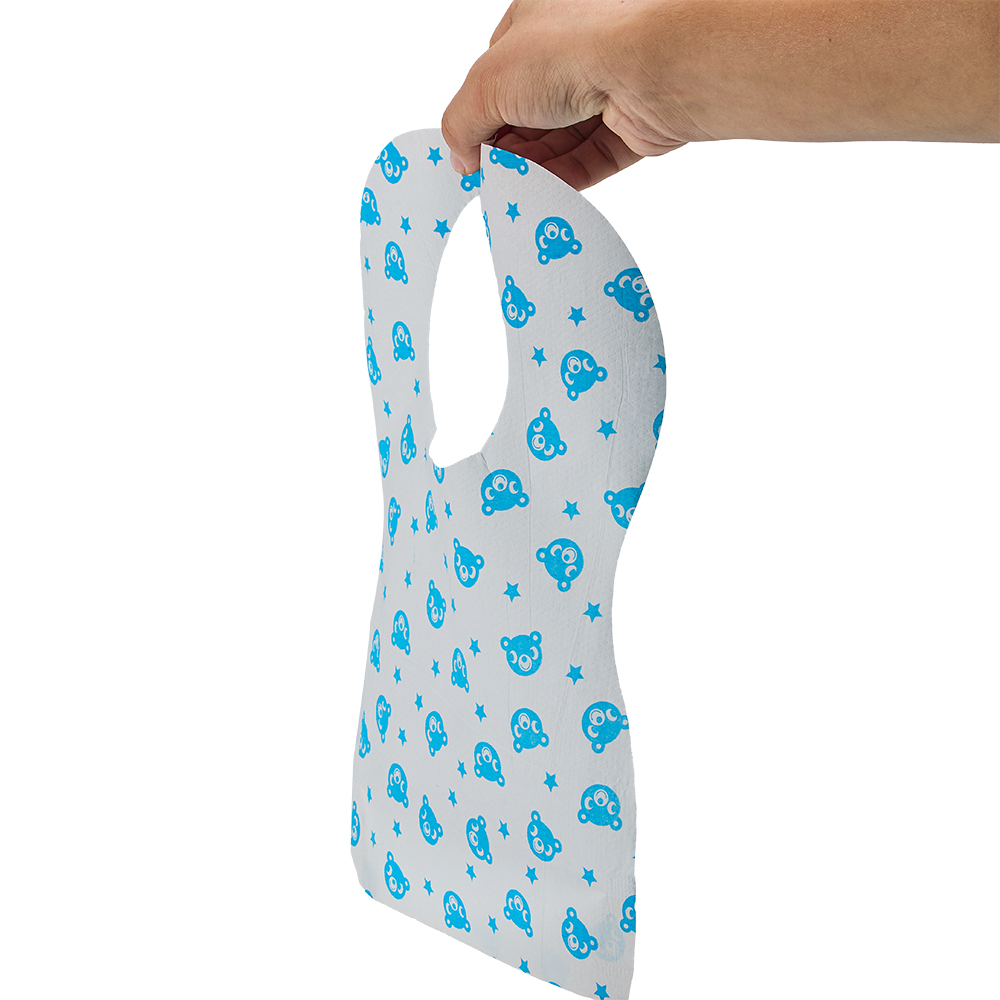 R: I nostri bavaglini monouso per l'alimentazione sono bavaglini laminati in carta e PE: la carta offre morbidezza, mentre la pellicola in PE crea una barriera monouso affidabile, impermeabile e antiolio.