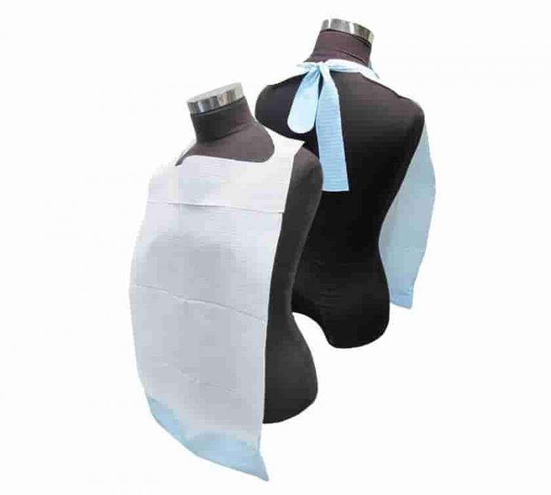 Bavaglino monouso per uso medico, dispositivo medico di Classe I certificato CE, in carta e pellicola di PE, con tasca per uso clinico, infermieristico e domiciliare.